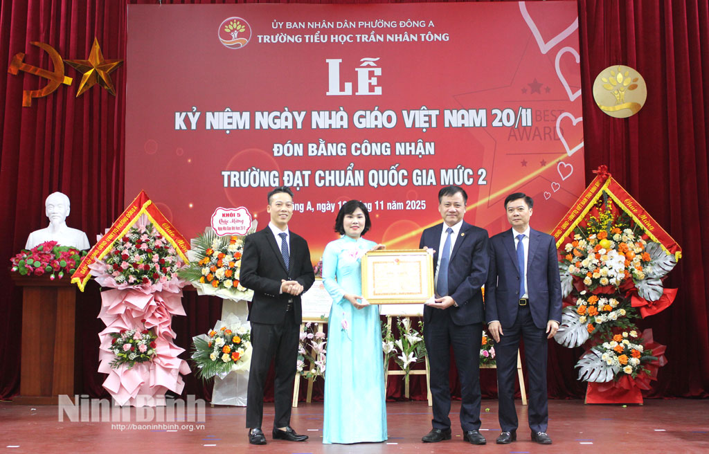 Lãnh đạo UBND phường Đông A trao Bằng công nhận trường đạt chuẩn quốc gia mức độ II cho tập thể Trường Tiểu học Trần Nhân Tông.