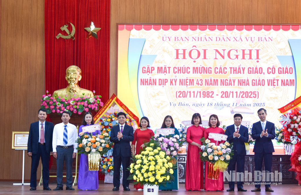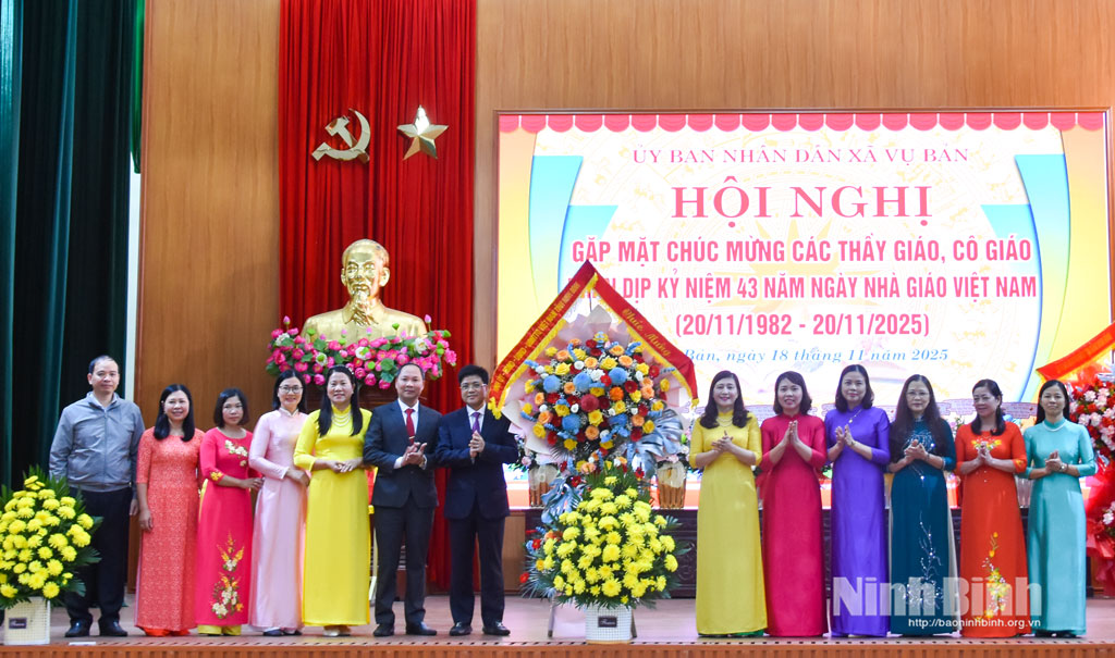 Phát biểu tại lễ kỷ niệm, đồng chí Trần Minh Hoan, Tỉnh ủy viên, Bí thư Đảng ủy, Chủ tịch HĐND xã Vụ Bản đã biểu dương thành tích, ghi nhận sự đóng góp của các nhà trường và các nhà giáo của ngành Giáo dục và Đào tạo xã; trân trọng cảm ơn toàn thể đội ngũ cán bộ, giáo viên, nhân viên ngành Giáo dục và Đào tạo đã và đang góp phần vào thành tích chung của ngành. Đồng chí mong muốn mỗi thầy, cô không ngừng học tập, rèn luyện, nâng cao chuyên môn nghiệp vụ; ứng dụng linh hoạt công nghệ trong giảng dạy; giữ gìn phẩm chất đạo đức, tác phong mẫu mực – xứng đáng là tấm gương sáng cho học sinh noi theo. Các nhà trường tiếp tục xây dựng môi trường sáng – xanh – sạch – đẹp; bảo đảm an toàn trường học; chú trọng giáo dục nhân cách, kỹ năng sống, khơi dậy tinh thần tự học, sáng tạo của học sinh; phát hiện, bồi dưỡng và lan tỏa các mô hình hay, cách làm sáng tạo; tôn vinh các nhà giáo tiêu biểu và tạo môi trường để các thầy cô phát huy năng lực, cống hiến cho ngành giáo dục.
