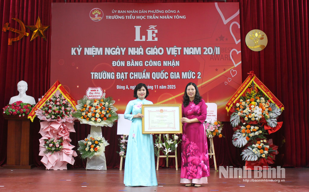 Tại buổi lễ, đồng chí Phó Chủ tịch HĐND tỉnh Mai Thanh Long và đồng chí Bí thư Đảng ủy phường Đông A Nguyễn Xuân Hồng đã trao Bằng khen của Chủ tịch UBND tỉnh cho tập thể nhà trường; tặng lẵng hoa tươi thắm chúc mừng thầy và trò nhà trường. Lãnh đạo UBND phường Đông A trao Bằng công nhận trường đạt chuẩn quốc gia mức độ II, Kiểm định chất lượng giáo dục mức độ 3 cho Trường Tiểu học Trần Nhân Tông.