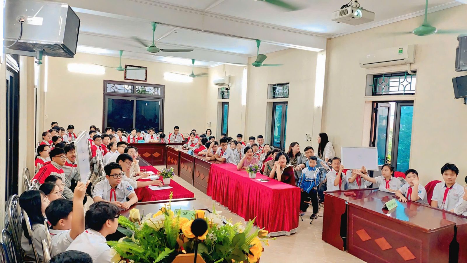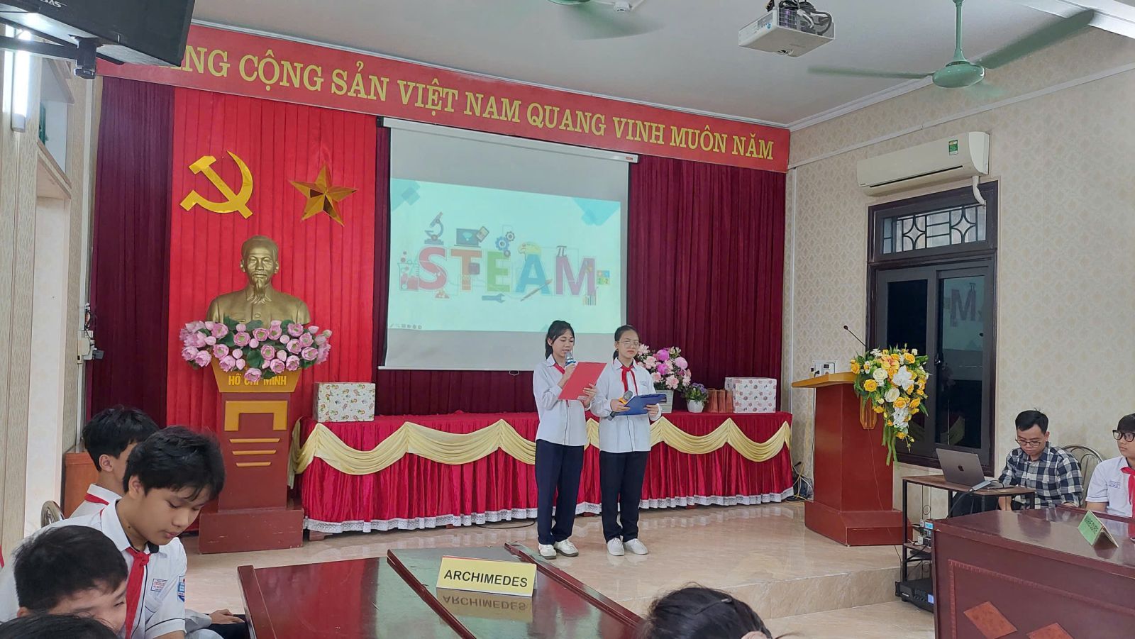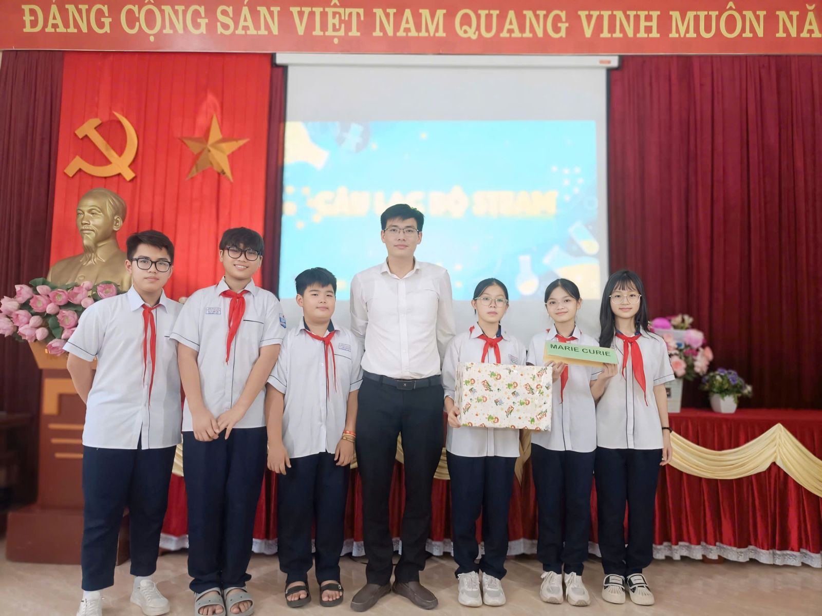 Đến dự chương trình có sự hiện diện của các thầy cô trong Ban giám hiệu nhà trường, cùng các thầy cô đại diện cho các tổ chuyên môn: Toán- Tin, Văn- Sử, Ngoại Ngữ, Văn- Thể – Mỹ, Thực Nghiệm và các thầy cô giáo trong toàn Câu lạc Bộ Steam. Sự có mặt của quý thầy cô là niềm động viên to lớn, thể hiện sự quan tâm, đồng hành của nhà trường trong việc xây dựng môi trường học tập tích cực và sáng tạo cho học sinh.