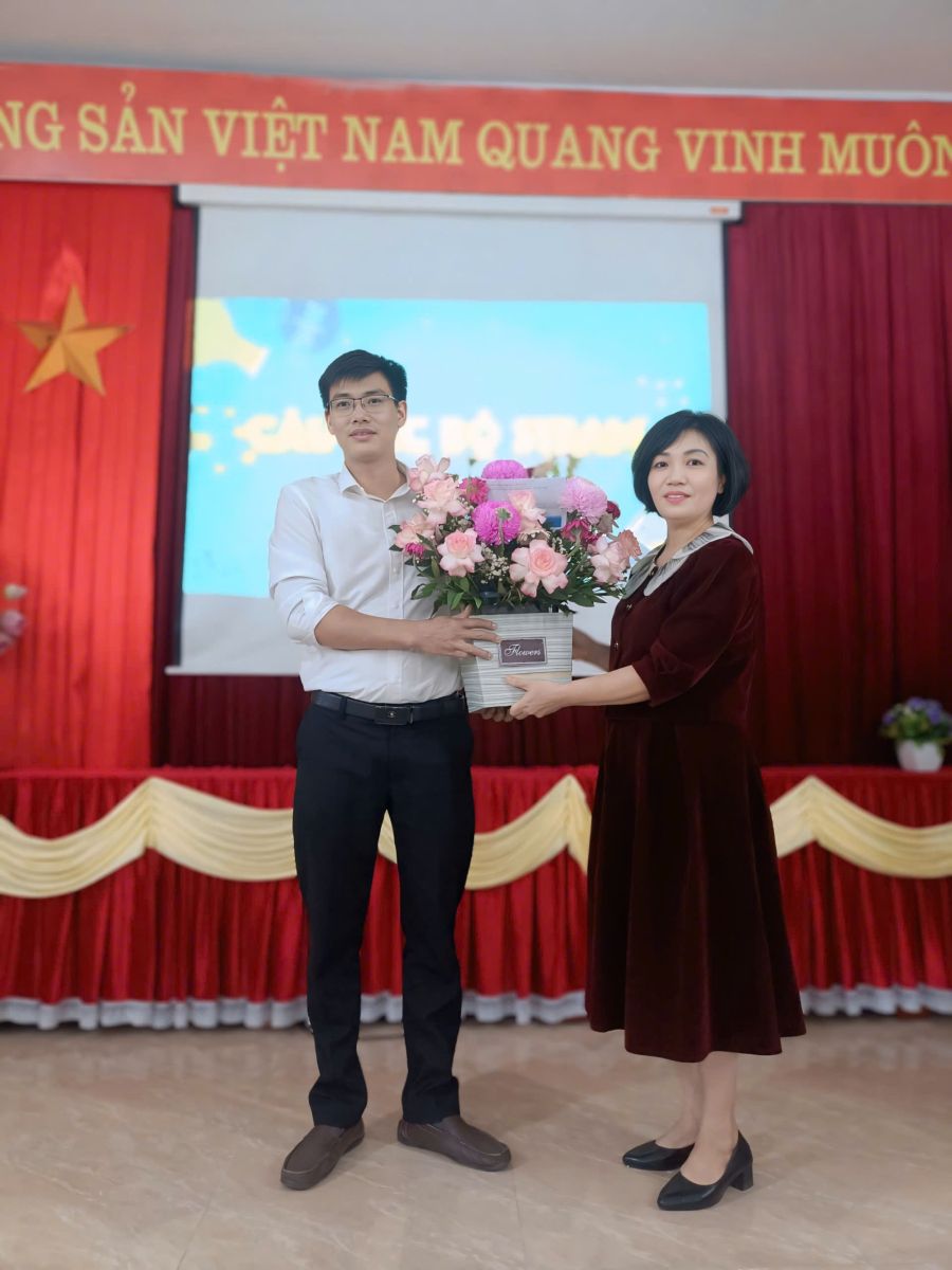 Ảnh 23: Cô giáo Phạm Thị Thu Hà, đại diện BGH nhà trường tặng hoa chúc mừng CLB.