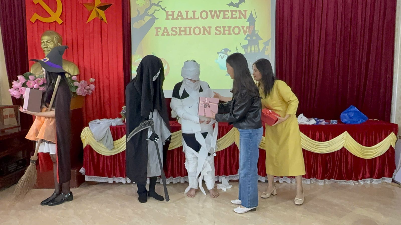 Cô Mai Thị Thu Phong – PHT phụ trách nhà trường trao phần thưởng cho các đội tham gia phần thi hóa trang.