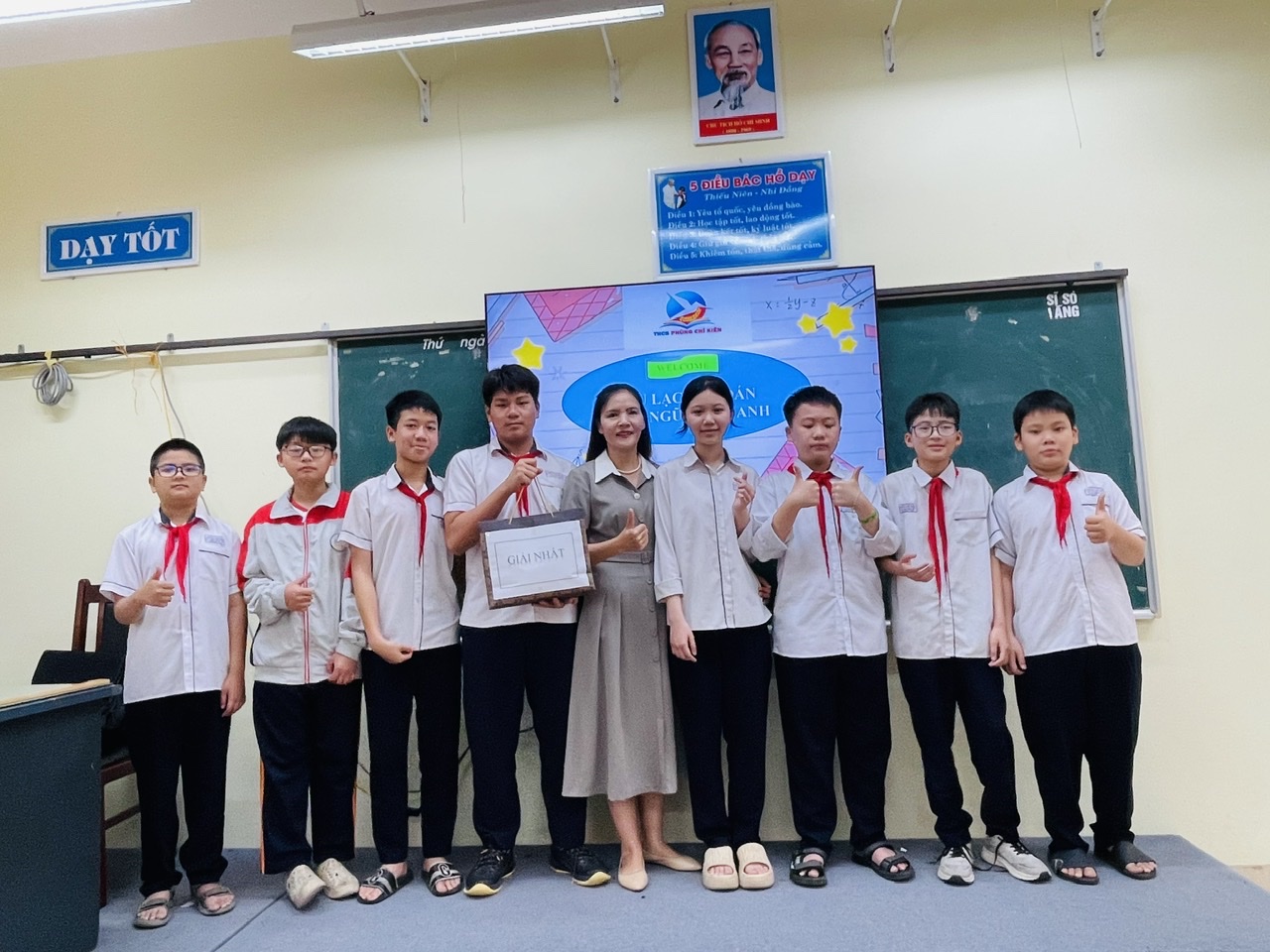 Cô giáo Vũ Thị Thim tổ phó tổ Toán – Tin và các em trong đội đạt giải Nhất