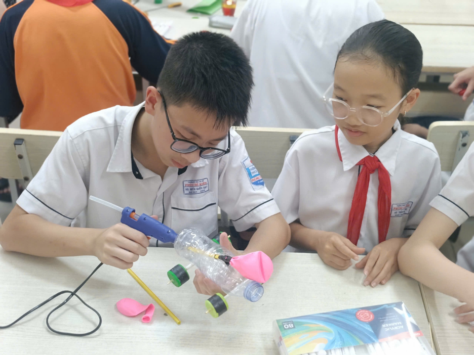Tiếp theo chương trình, các em được giới thiệu về nguyên lý hoạt động của xe chuyển động bằng lực đẩy từ không khí và cách tận dụng các vật liệu tái chế trong đời sống. Với những kiến thức đã học, học sinh nhanh chóng bước vào phần thực hành: thiết kế và lắp ráp những chiếc xe đua độc đáo từ chai nhựa, nắp chai, ống hút, que gỗ và bóng bay.